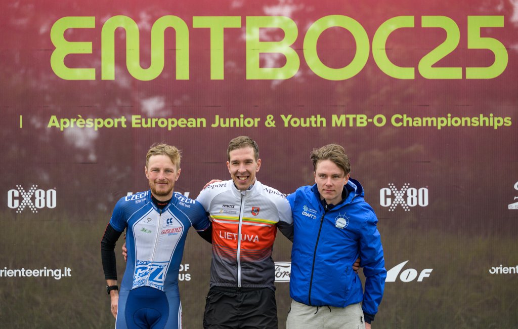 After getting the bronze medal yesterday, home rider Jonas Maišelis went two places better today, taking the gold by 10 seconds ahead of the current world rankings leader, the Czech Vojtech Ludvik, who for the second day running took the silver medal. Third was the Finnish rider Teemu Kaskonen, only 19 seconds down on the winner. Yesterday’s Mass Start winner Samuel Pokala FIN was seen on GPS tracking to be leading the race for much of the way, but according to the Finnish Orienteering Federation he skipped a control and was therefore registered as mispunched. Also in this race there were many route choices on the in places quite complex path network in undulating terrain – some of the routes proving rather more optimal than others.