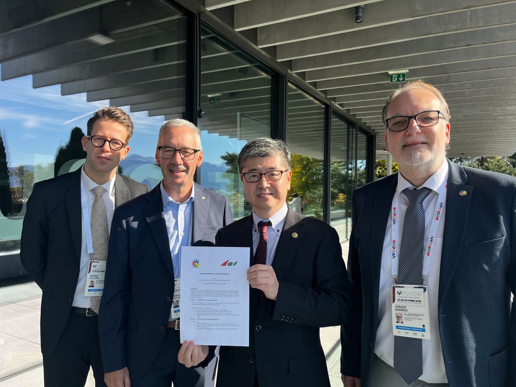 From the left: IOF General Secretary Sondre Gullord, IOF President Tom Hollowell, ICSD Vice President Yutaka Osugi and ICSD International Sports Director, Jürgen Endress after signing the MoU at the International Federation Forum in Lausanne, Switzerland.